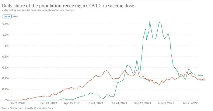 در نمودارهای مقایسهای، با توجه به گسترش واکسیناسیون کرونا از شهریور تا اواخر آذر ماه ۱۴۰۰، روند افزایشی مناسبی در واکسیناسیون کشورمان اتفاق افتاد و این روند به مرور با تزریق هر دو دز واکسن به افراد بالای ۱۲ سال نزولی شد. در نمودارهای مقایسهای مشاهده میشود که ایران به نسبت متوسط جهانی وضعیت مناسبی دارد و این در حالی است که در حال حاضر علاوه بر تزریق دز اول و دوم به افرادی که هنوز این دو نوبت واکسن را دریافت نکردند، تزریق دز سوم هم در ایران در حال انجام است.