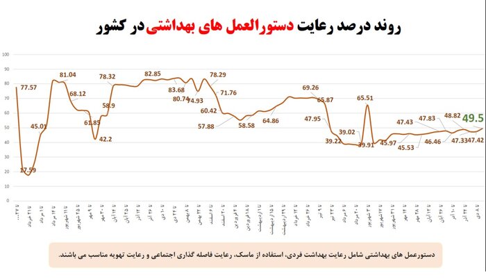 بر اساس نمودارهای مرکز بهداشت محیط وزارت بهداشت، میزان رعایت پروتکلهای بهداشتی در کشور با اندکی افزایش به ۴۹.۵ درصد رسیده است و به نسبت هفتههای گذشته، این شاخص با کمی بهبود مواجه بود.