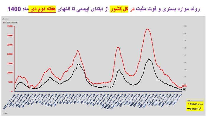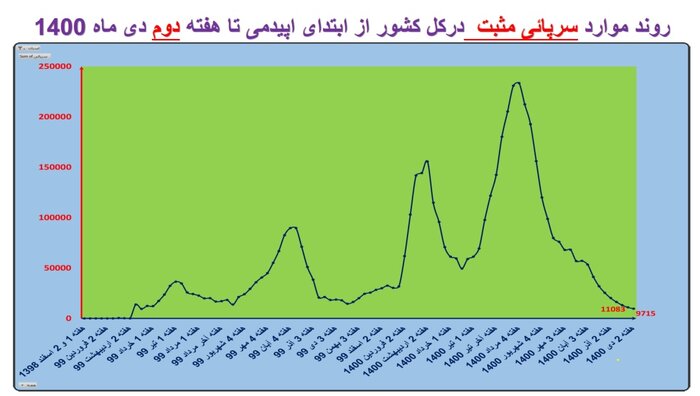 آمارهای وزارت بهداشت نشان میدهد: در دومین هفته دی ماه ۱۴۰۰ روند متوسط وضعیت بیماران بستری و فوتی کرونا در کشور همچنان کاهشی است و افزایشی در این روند مشاهده نمیشود. تعداد موارد بستری جدید در هفته اخیر ۲ هزار و ۱۴۶ نفر بود که به نسبت هفته قبلتر که این میزان ۲ هزار و ۲۷۷ نفر بوده، با کاهش مواجه شده است.