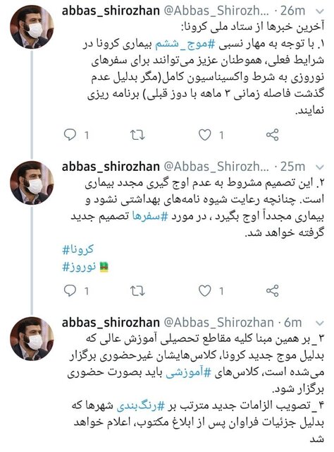 به گزارش پایگاه خبری پزشکان و قانون (پالنا)، عباس شیراوژن در پیامی توییتری مصوبات ستاد ملی کرونا درباره سفرهای نوروزی را تشریح کرد.