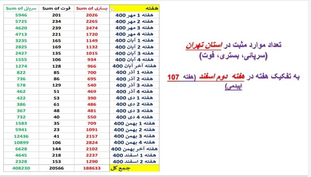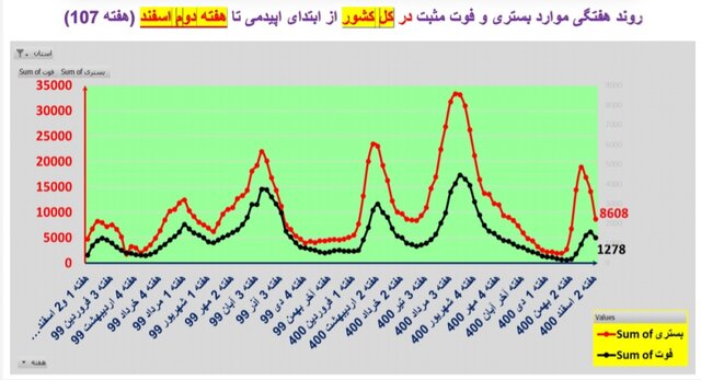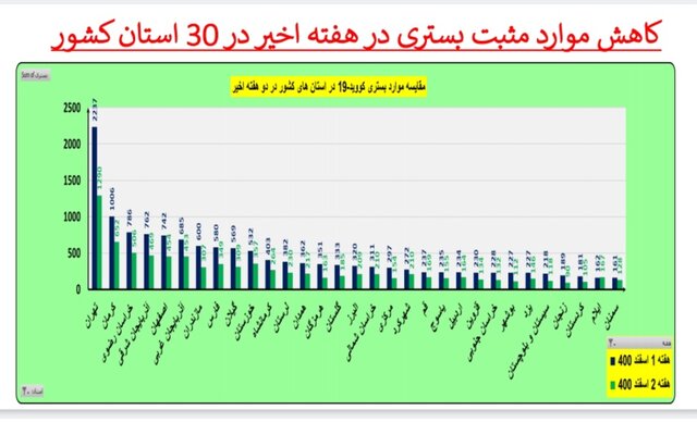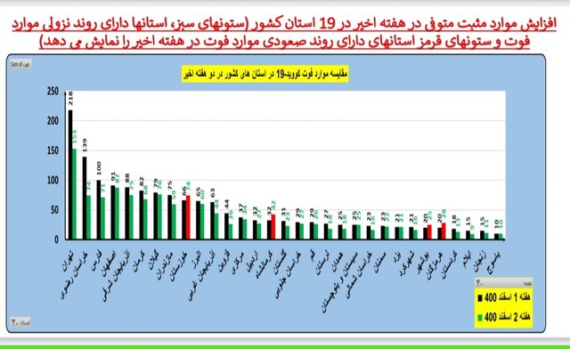 در عین حال در هفته اخیر شاهد کاهش موارد مثبت بستری در هفته اخیر در ۳۰ استان کشور بودهایم. همچنین افزایش موارد مثبت متوفی در هفته اخیر در ۱۹ استان گزارش شده است.