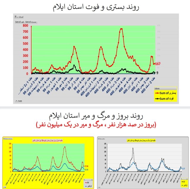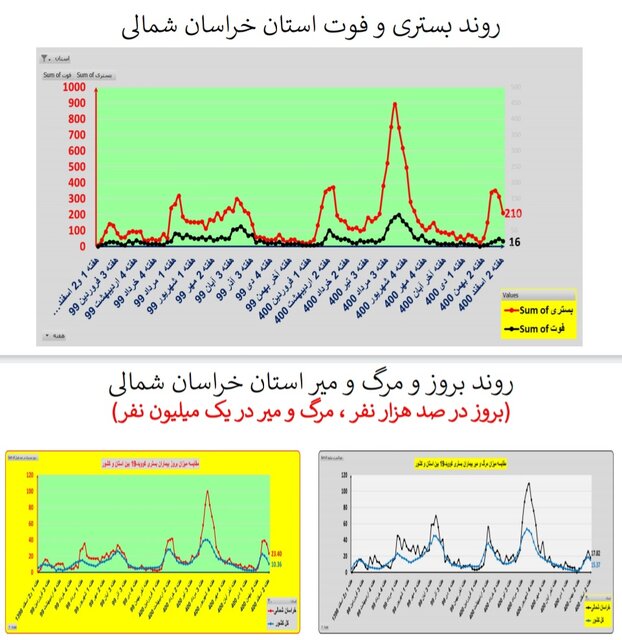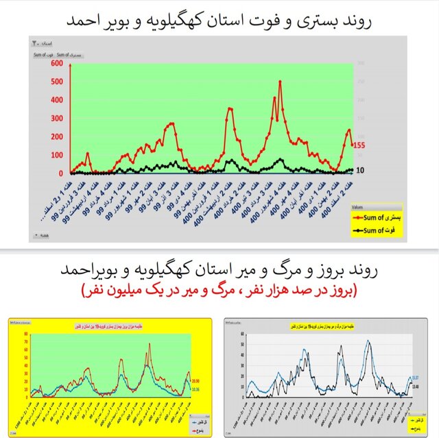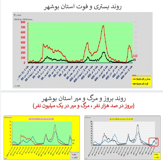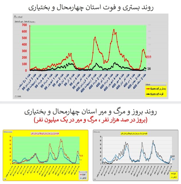 در هفته اخیر موارد بستری و فوت استان کاهش یافته است. بروز موارد بستری و میزان مرگومیر از متوسط کشور بالاتر است.