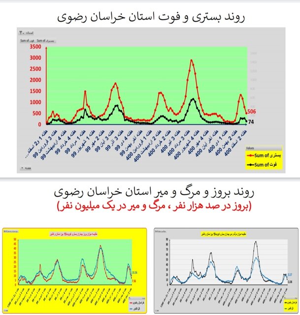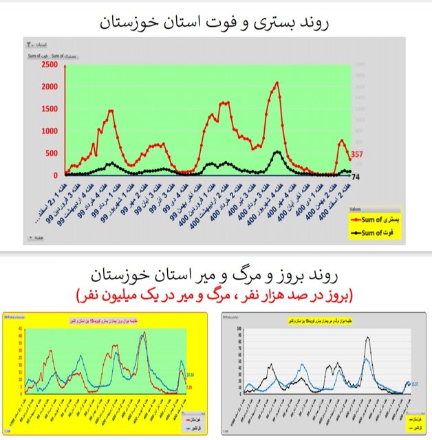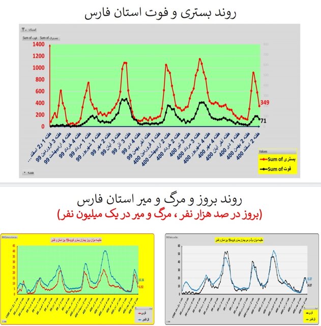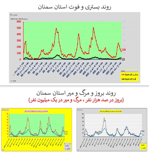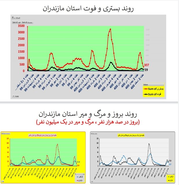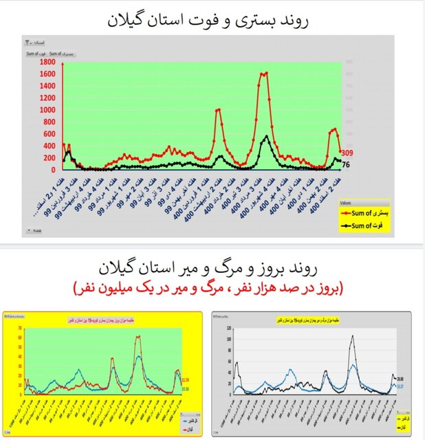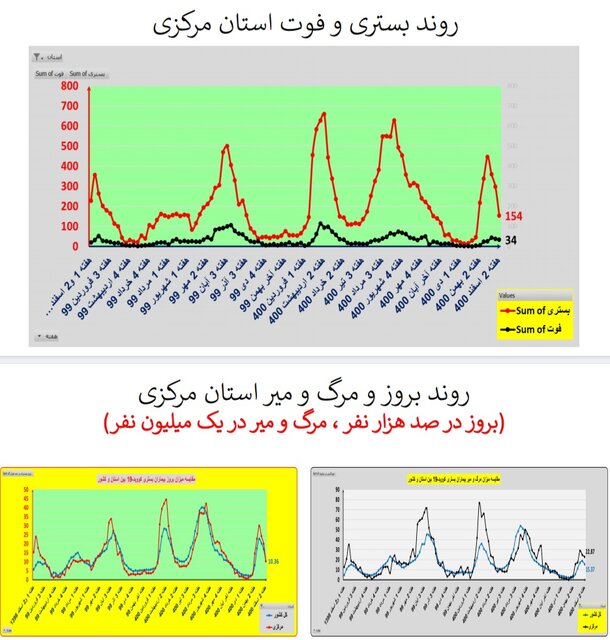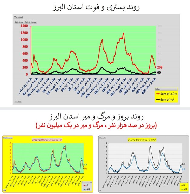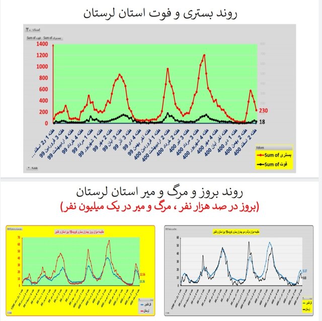 در هفته اخیر موارد بستری و فوت استان کاهش نشان میدهد. بروز موارد بستری و میزان مرگومیر استان از متوسط کشور بیشتر است.