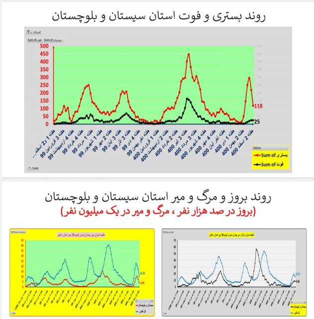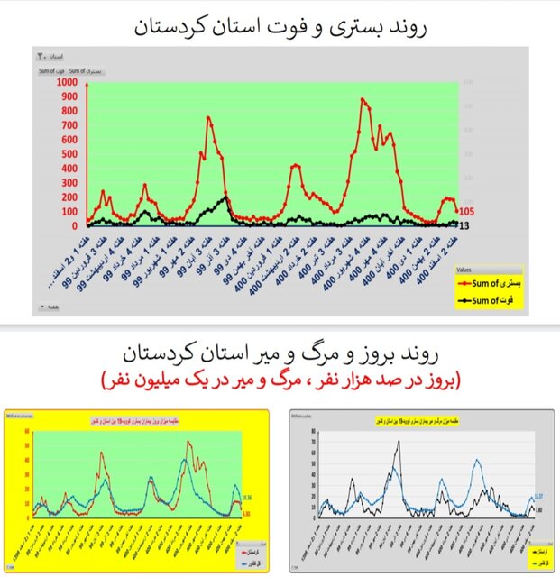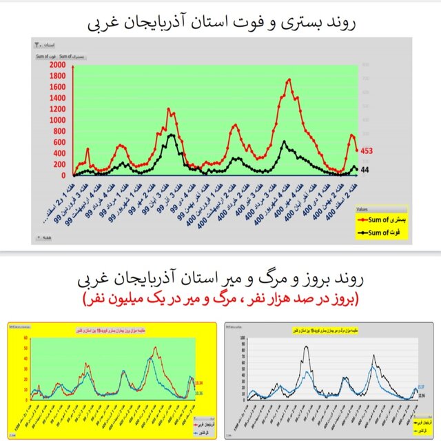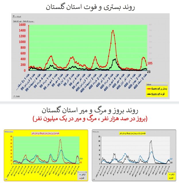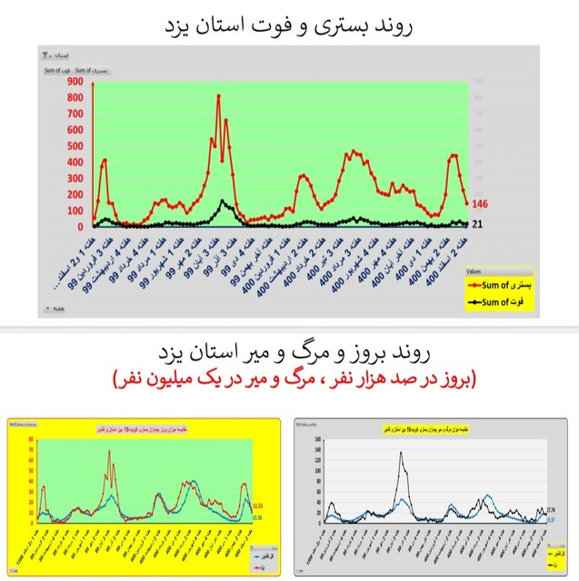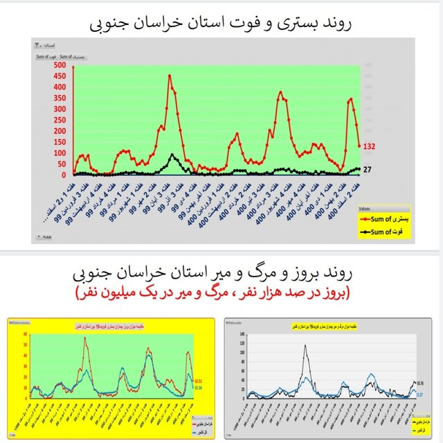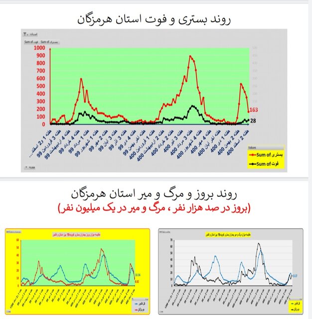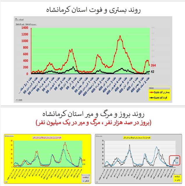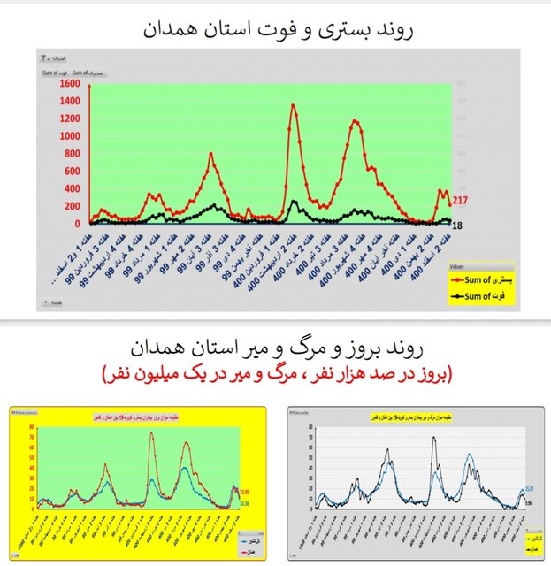 در هفته اخیر موارد بستری و فوت استان کاهش یافته است. بروز موارد بستری و میزان مرگومیر استان از متوسط کشور بالاتر است.