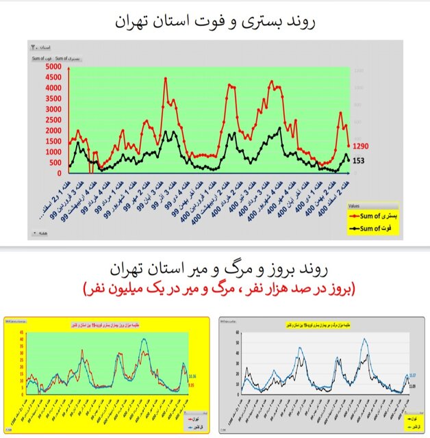 در عین حال در هفته اخیر موارد بستری و فوت استان تهران کاهش یافته است. بروز موارد بستری و میزان مرگومیر از متوسط کشور کمتر است.