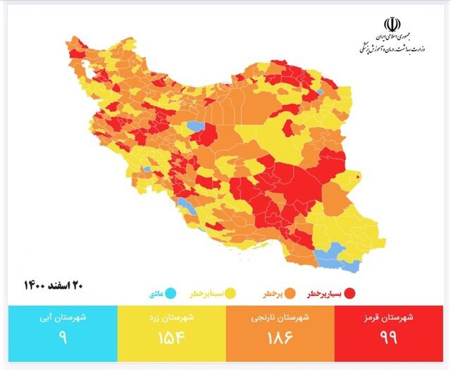 به گزارش پایگاه خبری پزشکان و قانون (پالنا)، بر اساس آخرین نقشه رنگبندی کرونایی کشور که از سوی وزارت بهداشت، منتشر شده، در حال حاضر ۹۹ شهر کشور در وضعیت قرمز، ۱۸۶ شهر در وضعیت نارنجی، ۱۵۴ شهر در وضعیت زرد و ۹ شهر در وضعیت آبی قرار دارد.