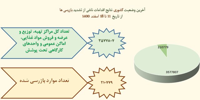 در عین حال طبق اعلام معاونت بهداشت وزارت بهداشت، بر اساس اقدامات ناشی از تشدید بازرسیها از تاریخ ۱۱ تا ۱۸ اسفند ماه ۱۴۰۰، از تعداد ۳۵۷۷۸۰۷ مراکز تهیه، توزیع و عرضه و فروش مواد غذایی، اماکن عمومی و واحدهای کارگاهی تحت پوشش، بالغ بر ۲۱۰۷۷۹ مورد بازرسی انجام شده است.