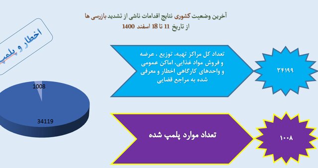 همچنین طی این مدت تعداد ۳۴۱۹۹ مرکز از مراکز تهیه، توزیع، عرضه و فروش مواد غذایی، اماکن عمومی و واحدهای کارگاهی اخطار گرفته و به مراجع قضایی معرفی شدهاند و ۱۰۰۸ مورد از این مراکز نیز پلمب شدهاند.
