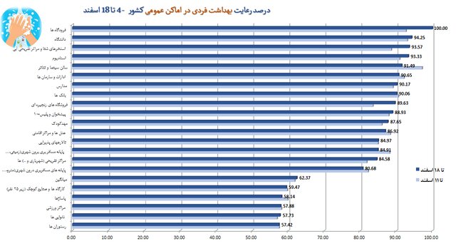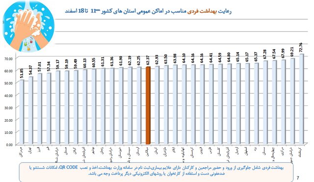 در عین حال میانگین میزان رعایت بهداشت فردی در اماکن عمومی استانهای کشور در بازه زمانی ۱۱ تا ۱۸ اسفند ماه ۱۴۰۰، بالغ بر ۶۲.۳۷ درصد بوده است. در این شاخص بیشترین میزان رعایت در استان کرمانشاه با ۷۲.۷۸ درصد و کمترین میزان رعایت هم در استان هرمزگان با ۵۱.۸۵ درصد بوده است.