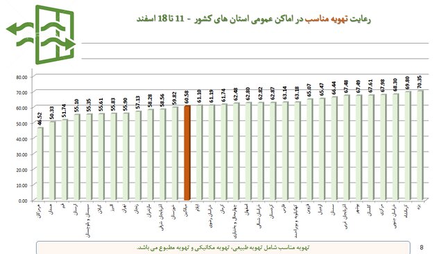 میانگین رعایت تهویه مناسب در اماکن عمومی استانهای کشور از ۱۱ تا ۱۸ اسفند ماه ۱۴۰۰، ۶۰.۵۸ درصد بوده است. در عین حال بیشترین میزان رعایت مربوط به استان یزد با ۷۰.۳۵ درصد و کمترین میزان رعایت مربوط به هرمزگان با ۴۶.۵۲ درصد بوده است.