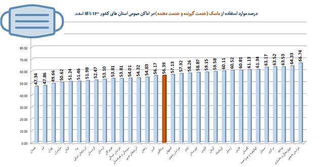 میانگین استفاده از ماسک در شاغلین و خدمت گیرندگان به تفکیک اماکن عمومی استانهای کشور ۱۱ تا ۱۸ اسفند ماه ۱۴۰۰، ۵۶.۳۹ درصد بوده است که بیشترین میزان رعایت در استان خراسان جنوبی با ۶۶.۷۴ درصد و کمترین میزان رعایت مربوط به همدان با ۴۷.۳۴ درصد بوده است.