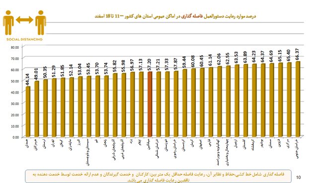 میانگین درصد رعایت پروتکل فاصلهگذاری در اماکن عمومی استانهای کشور از ۱۱ تا ۱۸ اسفند ماه ۱۴۰۰، ۵۷.۲۰ درصد بوده است که بیشترین میزان رعایت مربوط به استان خراسان جنوبی با ۶۶.۳۷ درصد و کمترین میزان رعایت مربوط به همدان با ۴۴.۱۴ درصد بوده است.
