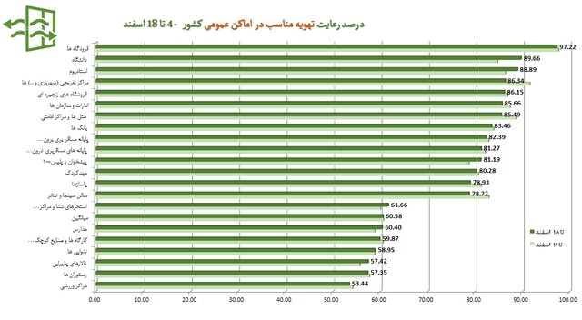 همچنین میانگین رعایت تهویه مناسب در اماکن عمومی کشور از ۴ تا ۱۸ اسفند ماه ۱۴۰۰، درصد بوده است. فرودگاهها با ۹۷.۲۲ درصد رعایت تهویه مناسب در بالاترین سطح رعایت و مراکز ورزشی با ۵۳.۴۴ درصد در قعر رعایت این پروتکل قرار دارند.