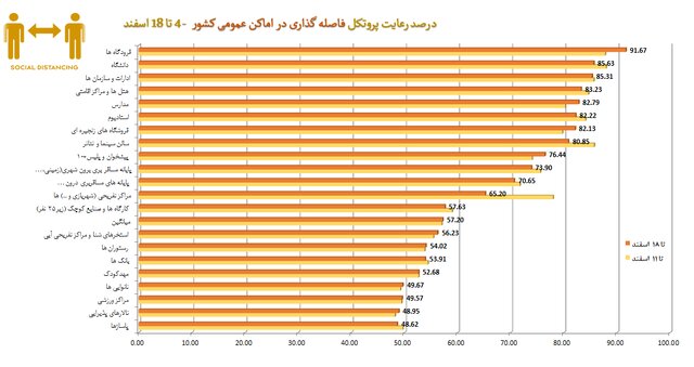 همچنین میانگین درصد رعایت پروتکل فاصلهگذاری در اماکن عمومی کشور از ۴ تا ۱۸ اسفند ماه ۱۴۰۰، ۵۷.۲۰ درصد بوده که فرودگاهها با ۹۱.۶۷ درصد بیشترین درصد رعایت و پاساژها با ۴۸.۶۲ درصد کمترین میزان رعایت را داشتهاند.
