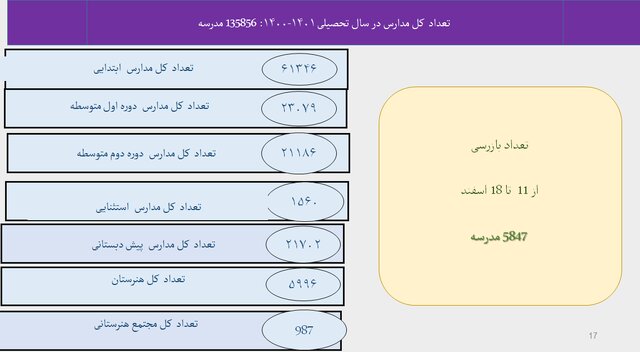 تعداد کل مدارس در سال تحصیلی ۱۴۰۰-۱۴۰۱، بالغ بر ۱۳۵۸۵۶ مدرسه است. از ۱۱ تا ۱۸ اسفند ماه ۱۴۰۰ نیز ۵۸۴۷ مورد بازرسی انجام شده است.