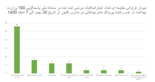 شکایت از مدارس نیز با فراوانی موضوع شکایت عدم رعایت فاصله گذاری اجتماعی نیز ۳۲ مورد شکایت بوده است.