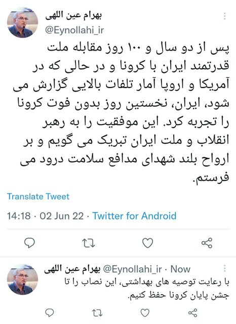 به گزارش پایگاه خبری پزشکان و قانون (پالنا)، بهرام عین اللهی در حساب توییتر خود نوشت:«