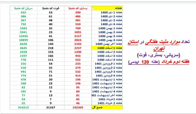 در استان تهران نیز تعداد موارد سرپایی مثبت شناسایی شده در هفته اخیر ۳۵ نفر، تعداد موارد بستری جدید در هفته اخیر ۴۶ نفر و تعداد فوتیهای جدید در هفته اخیر ۹ نفر بوده است.