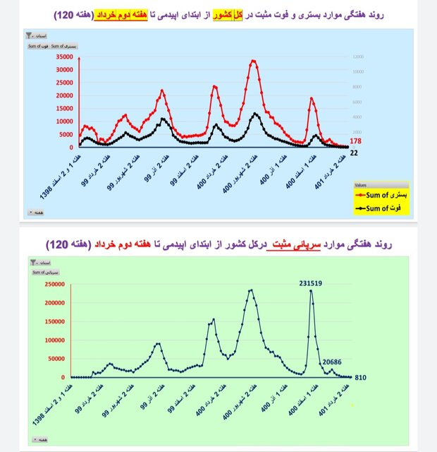 همچنین بر اساس اعلام وزارت بهداشت، در عین حال بررسی هفتگی وضعیت موجود کرونا در کشور در هفته دوم خرداد ماه ۱۴۰۱ مصادف با هفته ۱۲۰ همهگیری نشان میدهد که تعداد موارد سرپایی مثبت شناسایی شده، در هفته اخیر ۸۱۰ نفر بوده است. همچنین تعداد موارد بستری جدید در هفته اخیر ۱۷۸ نفر و تعداد فوتیها در هفته اخیر ۲۲ نفر بوده است.