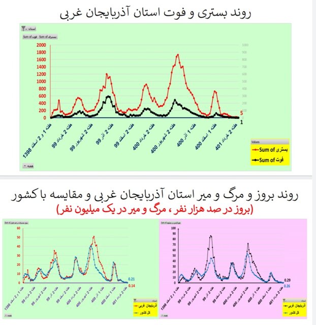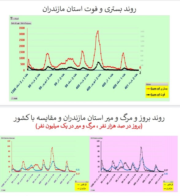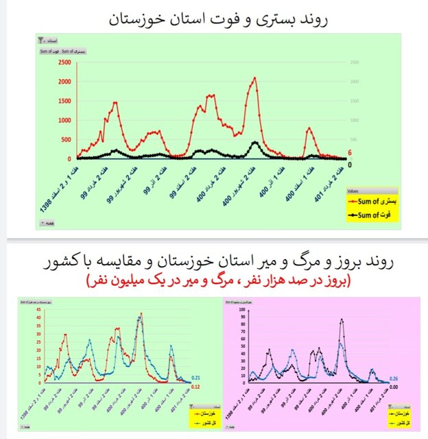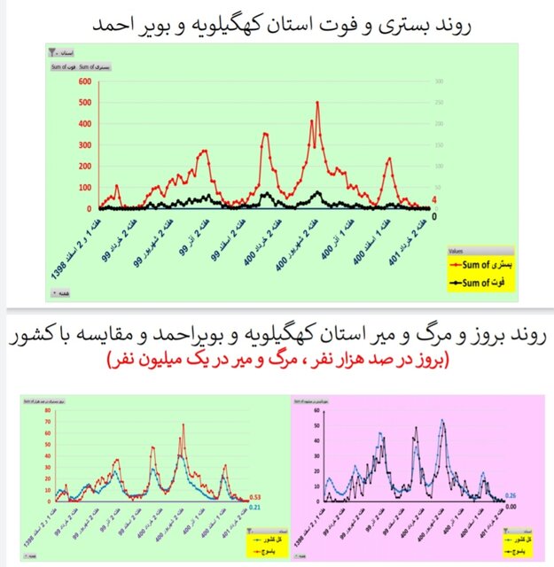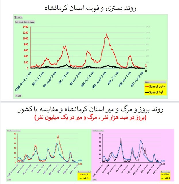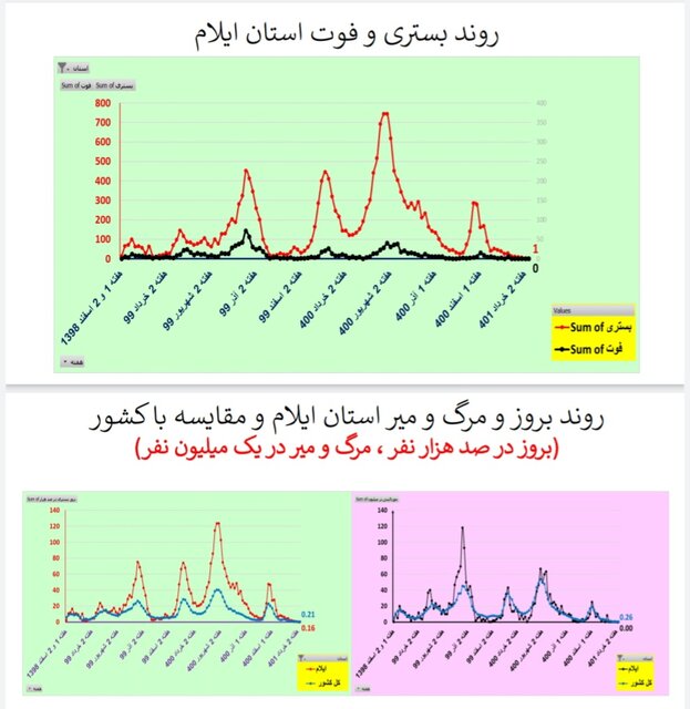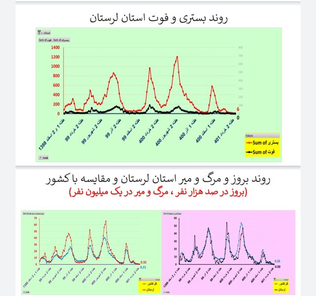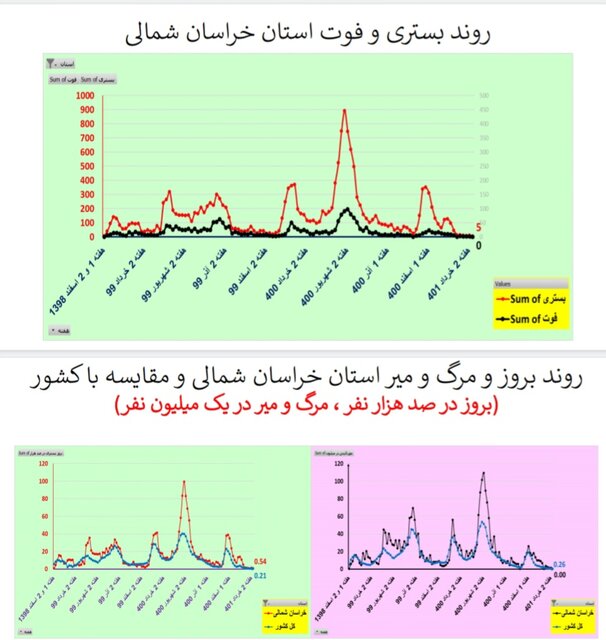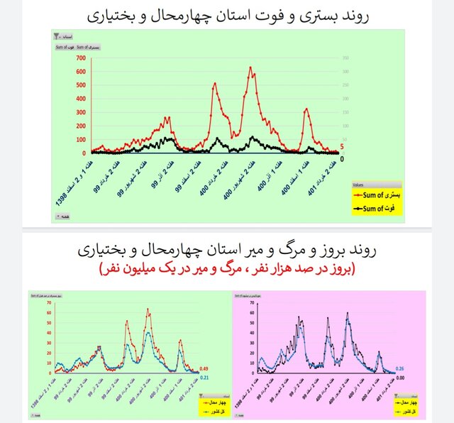 در هفته اخیر موارد بستری استان کاهش یافته و فوت استان افزایش مختصر داشته است. میزان بروز موارد بستری و مرگومیر استان از متوسط کشور بیشتر بوده است.