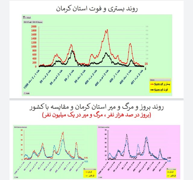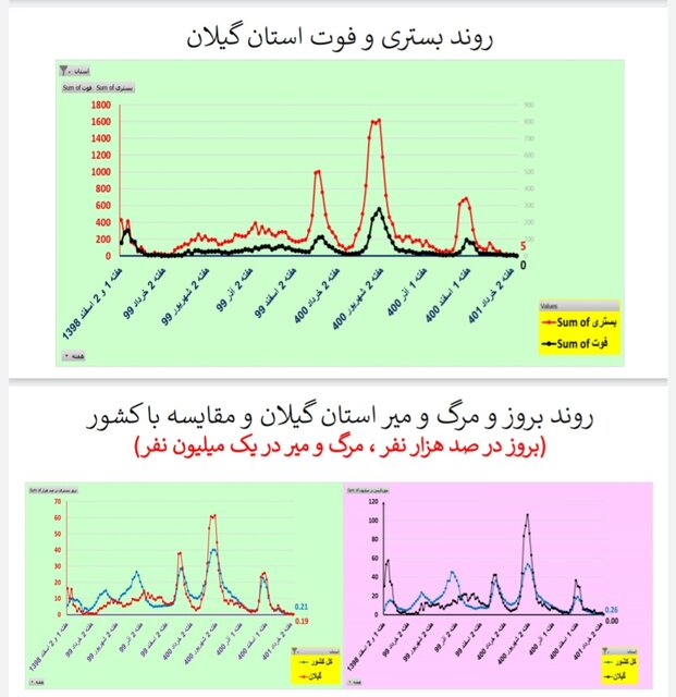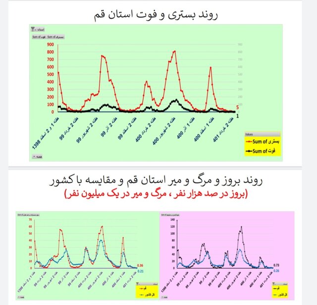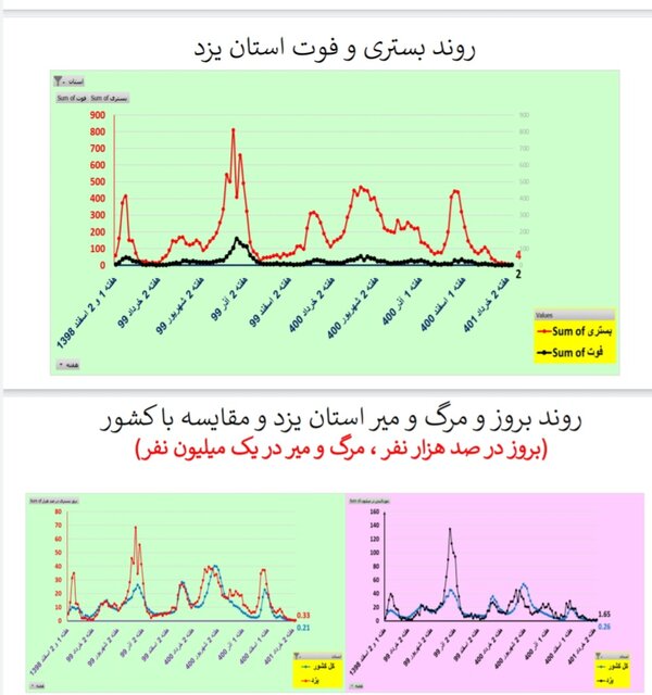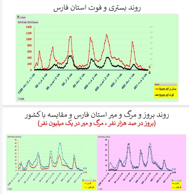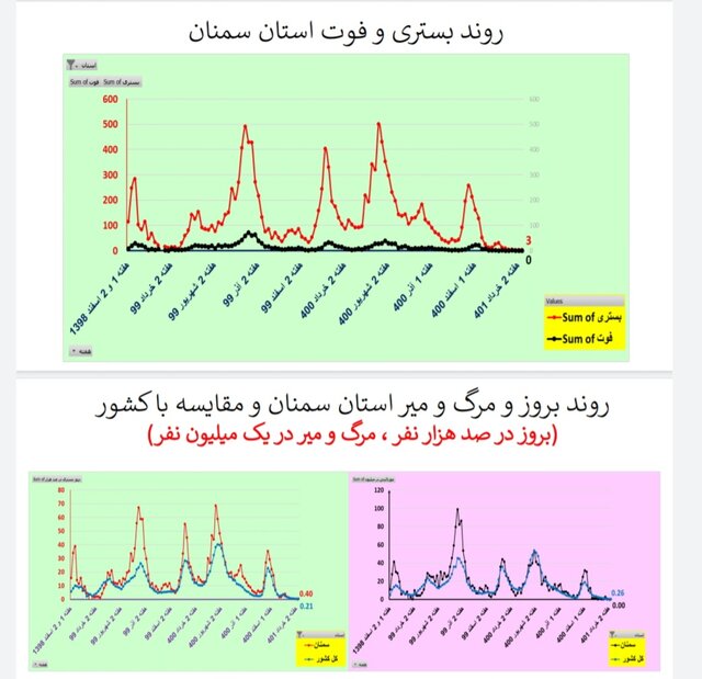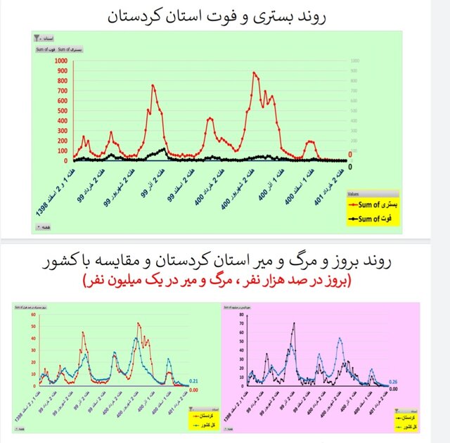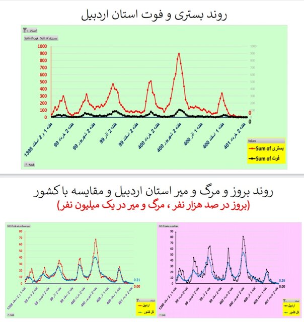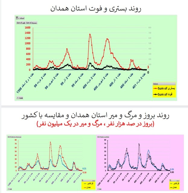در هفته اخیر موارد بستری استان کاهش یافته و فوت استان افزایش مختصر داشته است. میزان بروز موارد بستری و مرگومیر استان از متوسط کشور بیشتر بوده است.