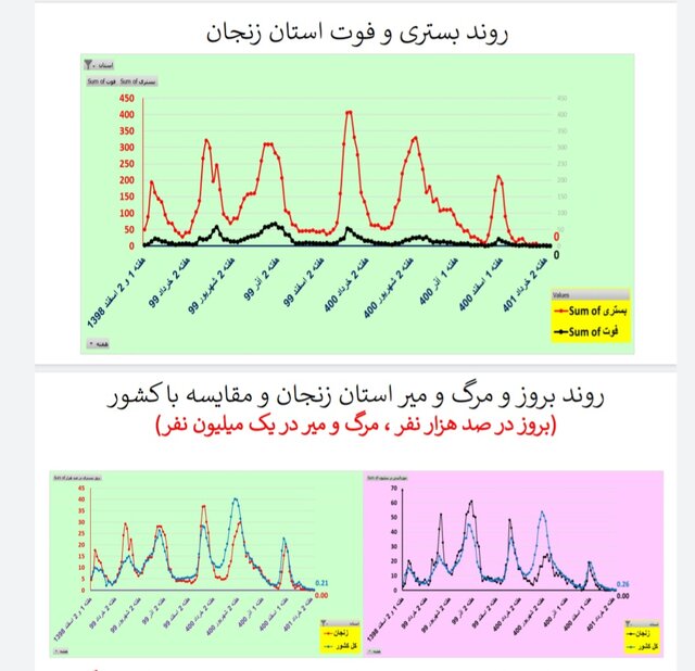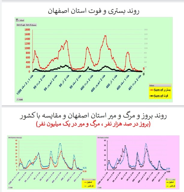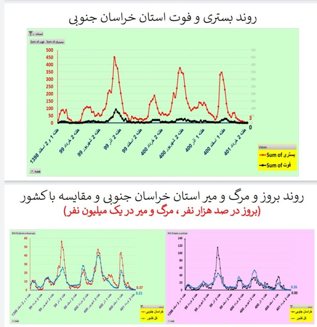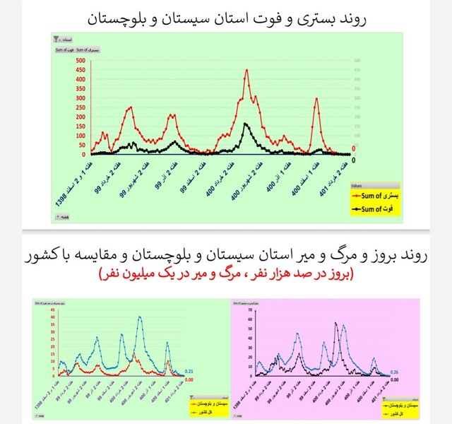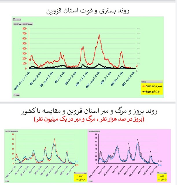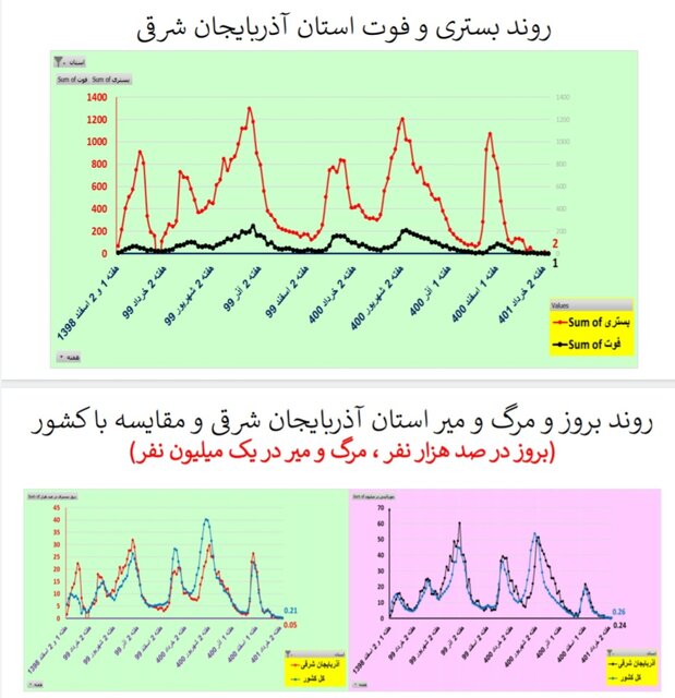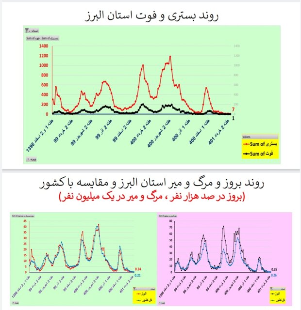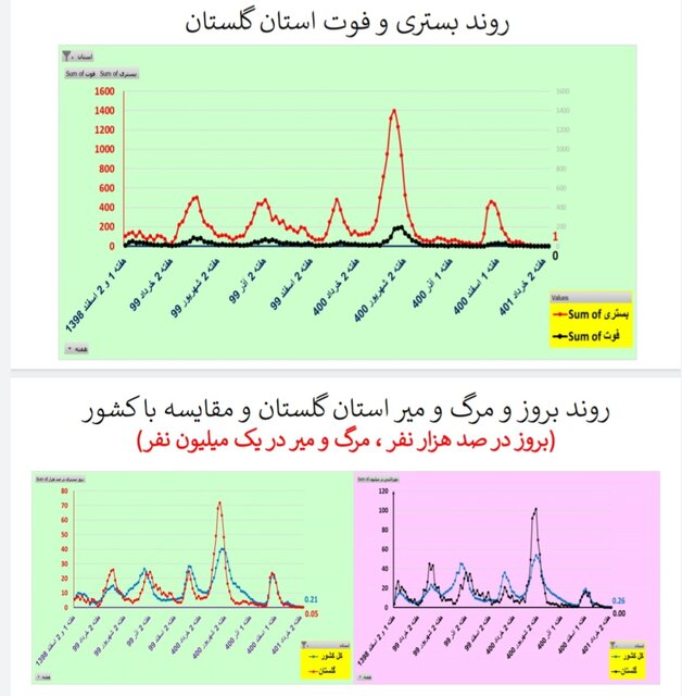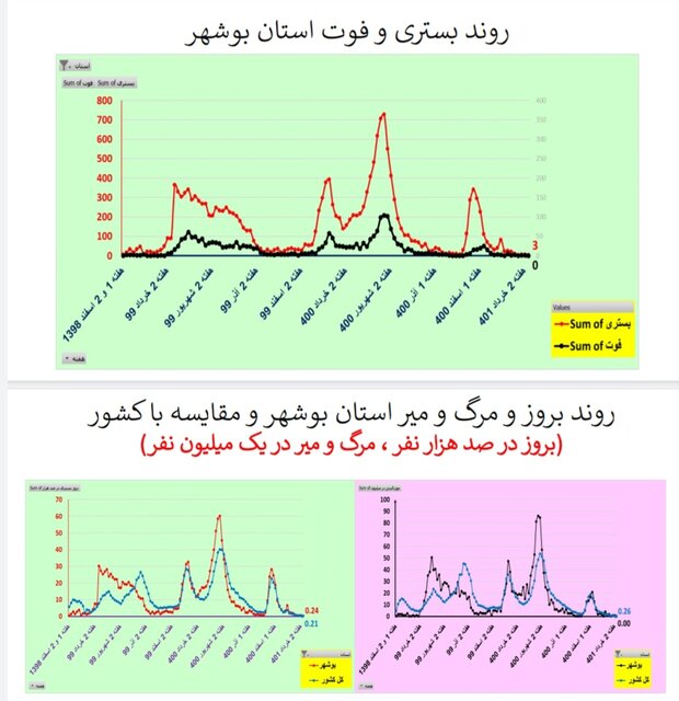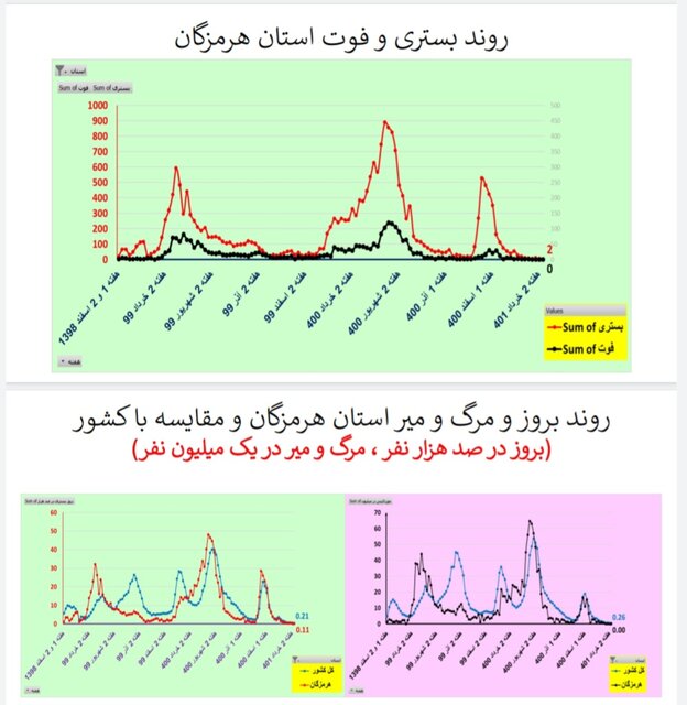 در هفته اخیر روند بستری و فوت استان نزولی بوده است. میزان بروز موارد بستری استان از متوسط کشور بالاتر و مرگومیر آن صفر بوده است.