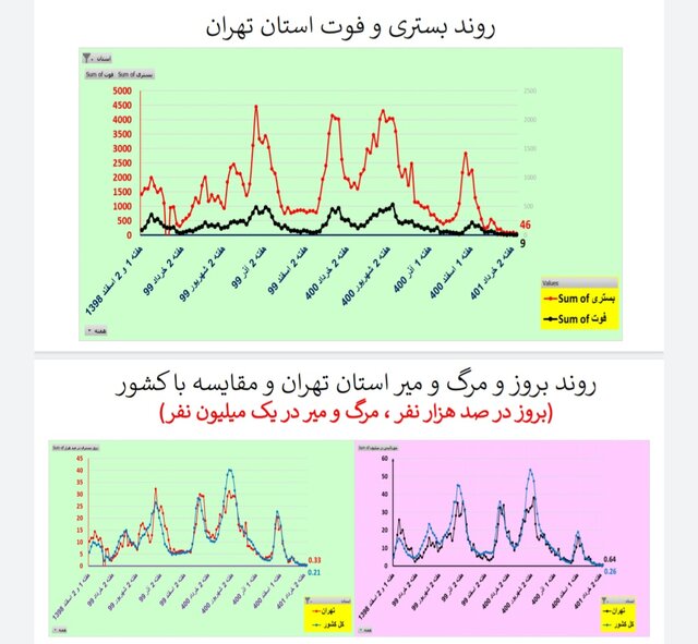 همچنین در استان تهران، در هفته اخیر موارد بستری کاهش یافته و فوت استان افزایش مختصر داشته است. بروز موارد بستری و میزان مرگومیر استان از متوسط کشور بالاتر بوده است.