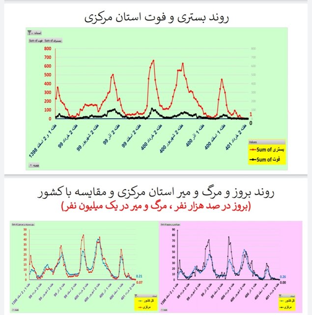 در هفته اخیر موارد بستری کاهشی و فوت استان ایستا بوده است. بروز موارد بستری و میزان مرگومیر استان از متوسط کشور بالاتر است.