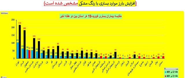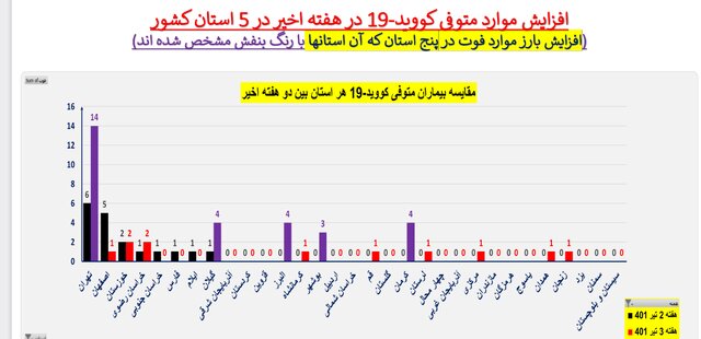 همچنین افزایش بارز موارد فوت نیز در پنج استان طی هفته اخیر گزارش شده است.