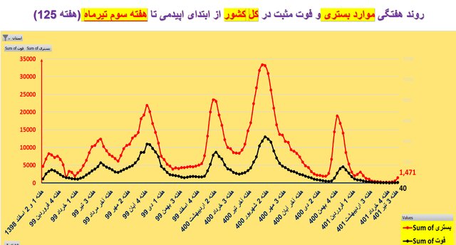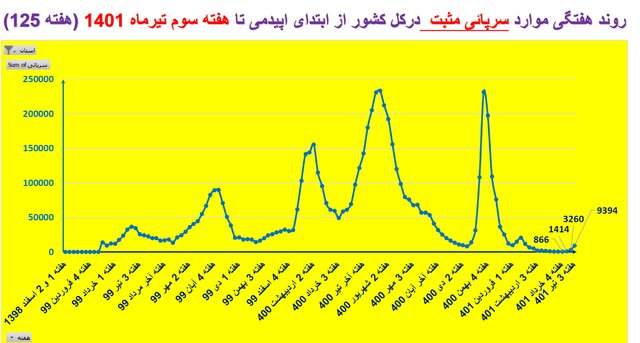 بنابر اعلام وزارت بهداشت، در هفته سوم تیرماه مصادف با هفته ۱۲۵ همهگیری در کشور، موارد بستری ناشی از کرونا به ۱۴۷۱ مورد رسیده است که این رقم در هفته قبل از آن ۵۹۱ مورد ثبت شده بود. همچنین موارد مثبت شناسایی شده سرپایی از ۳۲۶۰ مورد در هفته دوم به ۹۳۴۹ مورد در هفته سوم تیرماه و فوتی ها نیز در کل کشور از ۱۸ نفر در هفته دوم به ۴۰ نفر در هفته سوم تیرماه افزایش یافته است.