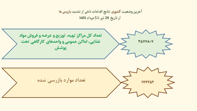 در عین حال طبق اعلام معاونت بهداشت وزارت بهداشت، بر اساس اقدامات ناشی از تشدید بازرسیها از تاریخ ۲۹ تیر تا ۵ مرداد ماه ۱۴۰۱، از تعداد ۳۵۷۷۸۰۷ مرکز تهیه، توزیع و عرضه و فروش مواد غذایی، اماکن عمومی و واحدهای کارگاهی تحت پوشش، بالغ بر ۱۷۷۲۵۲ مورد بازرسی انجام شده است.