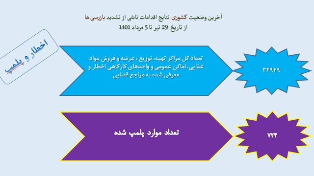 همچنین طی این مدت تعداد ۳۲۹۴۹ مرکز از مراکز تهیه، توزیع، عرضه و فروش مواد غذایی، اماکن عمومی و واحدهای کارگاهی اخطار گرفته و به مراجع قضایی معرفی شدهاند و ۷۲۴ مورد از این مراکز نیز پلمب شدهاند.