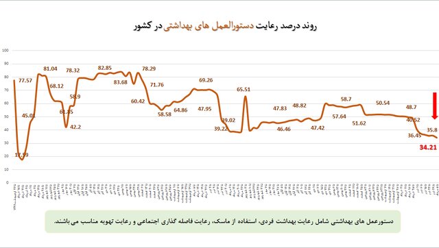 روند رعایت پروتکلهای بهداشتی ضدکرونا در همچنان کاهشی و در حد ۳۴ درصد است؛ درحالی که افزایش بارز بستری و افزایش موارد فوت کرونا در بسیاری از استانهای کشور گزارش شده و نگرانی از افزایش جانباختگان این بیماری در کشور وجود دارد.