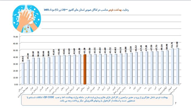 در عین حال میانگین میزان رعایت بهداشت فردی در اماکن عمومی استانهای کشور در بازه زمانی ۲۹ تیر تا ۵ مرداد ماه ۱۴۰۱، بالغ بر ۴۳.۲۸ درصد بوده است. در این شاخص بیشترین میزان رعایت در استان سیستان و بلوچستان با ۵۲.۳۸ درصد و کمترین میزان رعایت هم در استان هرمزگان با ۳۰.۹۲ درصد بوده است.