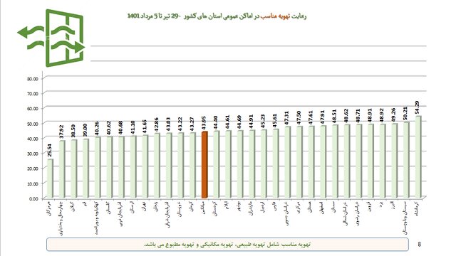 میانگین رعایت تهویه مناسب در اماکن عمومی استانهای کشور از ۲۹ تیر تا ۵ مرداد ماه ۱۴۰۱، ۴۳.۹۵ درصد بوده است. در عین حال بیشترین میزان رعایت مربوط به استان کرمانشاه با ۵۴.۲۹ درصد و کمترین میزان رعایت مربوط به هرمزگان با ۲۵.۵۴ درصد بوده است.