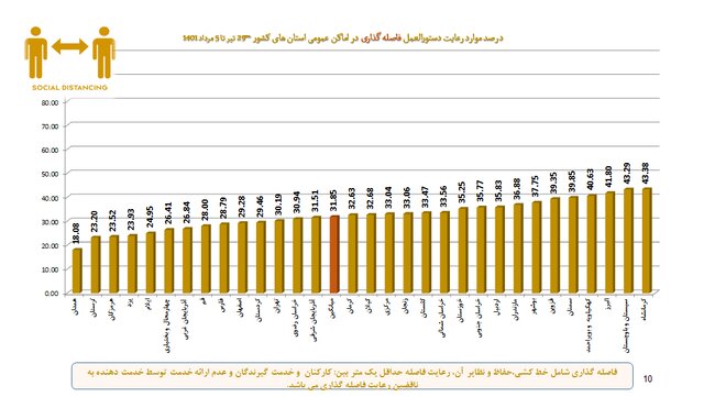 همچنین میانگین درصد رعایت پروتکل فاصلهگذاری در اماکن عمومی کشور از ۲۲ تیر تا ۵ مرداد ماه ۱۴۰۱، ۳۱.۸۵ درصد بوده که دانشگاهها با ۷۶.۵۶ درصد بیشترین درصد رعایت و استخرهای شنا و مراکز تفریحی آبی با ۲۴.۸۴ درصد کمترین میزان رعایت پروتکل فاصلهگذاری را داشتهاند.