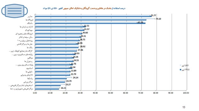 همچنین میانگین استفاده از ماسک در شاغلین و خدمت گیرندگان به تفکیک اماکن عمومی کشور نیز از ۲۲ تیر تا ۲ مرداد ماه ۱۴۰۱ بالغ بر ۲۴.۲۶ درصد بوده است که بیشترین میزان استفاده از ماسک در اماکن عمومی مربوط به مدارس با ۷۵.۷۷ درصد و کمترین میزان استفاده از ماسک مربوط به مراکز تفریحی با ۱۶.۱۱ درصد است.