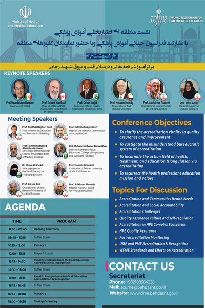 کنفرانس منطقه ای اعتبار بخشی دانشکده های پزشکی با تاکید بر ظرفیت های کشور با حضور نماینده کشورهای همسایه و نیز رییس فدراسیون جهانی آموزش پزشکی و سازمان جهانی بهداشت، ۲۰ اردیبهشت ماه، برگزار می شود.