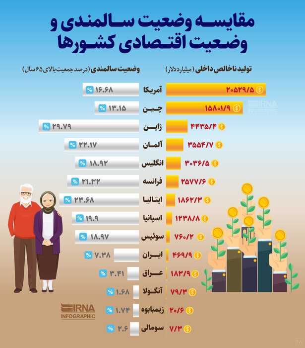شاخص دیگری که میتواند به عنوان معیار بررسی وضعیت رفاه و توسعه یافتگی کشورها مورد استفاده قرار گیرد، میزان تولید ناخالص داخلی کشورهاست. دادههای Global Economy نشان میدهد، بعد از دو قدرت اقتصادی دنیا یعنی آمریکا با تولید ناخالص سالانه بیش از ۲۰ هزار میلیارد دلار و چین با تولید ناخالص بیش از ۱۵ هزار میلیارد دلار به ترتیب کشورهای ژاپن، آلمان و انگلستان با تولید ناخالص ۴۴۰۰ تا سه هزار میلیارد دلاری بیشترین میزان تولید ناخالص داخلی را در میان کشورهای دنیا دارند، کشورهایی که در ردههای بالای سالمندترین کشورهای جهان قرار دارند.