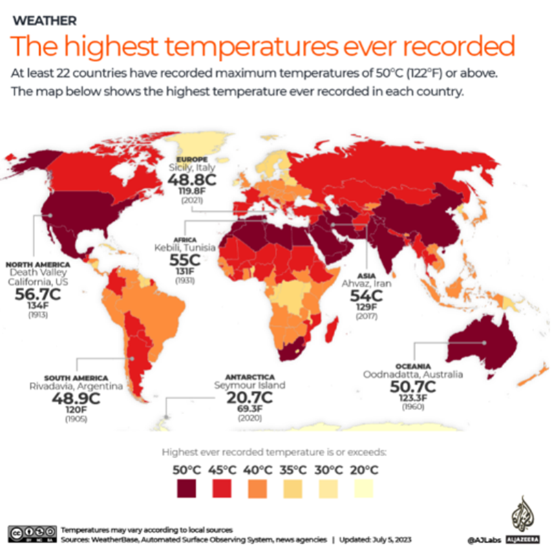 نقشه زیر گرمترین دمای ثبت شده در هر کشور را در سراسر جهان نشان میدهد. دستکم ۲۲ کشور حداکثر دمای ۵۰ درجه سانتیگراد "۱۲۲ فارنهایت" یا بالاتر را ثبت کردهاند.