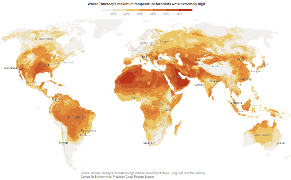 در شرق آسیا، امواج گرما رکوردهای دمایی را در سراسر چین شکسته است؛ جایی که مقامها هشدار دادهاند رطوبت بالا میتواند باعث افزایش تقریبی ۲۰ درجه فارنهایت شود. آن طور که در نقشه زیر مشاهده میشود، گرمای هوا از شرق آسیا گرفته تا خاورمیانه، آفریقا و آمریکای شمالی و لاتین را دربر گرفته است.