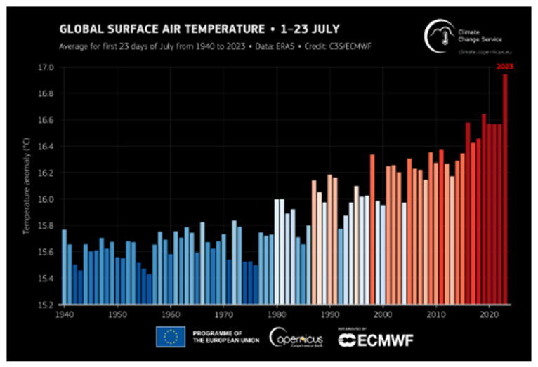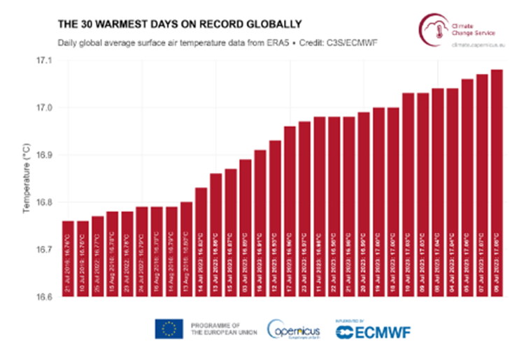 با نگاهی به نمودار زیر و رتبهبندی ۳۰ روز از گرمترین روزها، بالاترین "میانگین روزانه" دمای جهانی ثبت شده به روزهای ژوئیه ۲۰۲۳ "اواخر تیر و اوایل مرداد" برمیگردد.