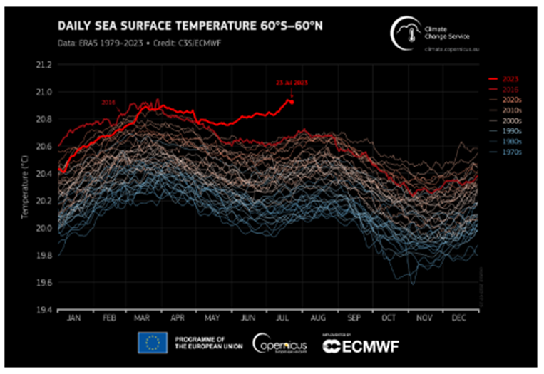 با نگاهی به نمودار زیر میتوان به این نکته پی برد که در این بازه زمانی، دمای سطح دریا نیز بسیار بالاتر از میانگین جهانی بوده است. در این نمودار که بازه زمانی ژانویه ۱۹۷۹ تا ژوئیه ۲۰۲۳ "دی ۱۳۵۷ تا اول مرداد ۱۴۰۲" را ترسیم کرده نشان میدهد که اینک دمای سطح دریا بیش از هر زمان دیگر، یک رکورد تاریخی را ثبت کرده است.