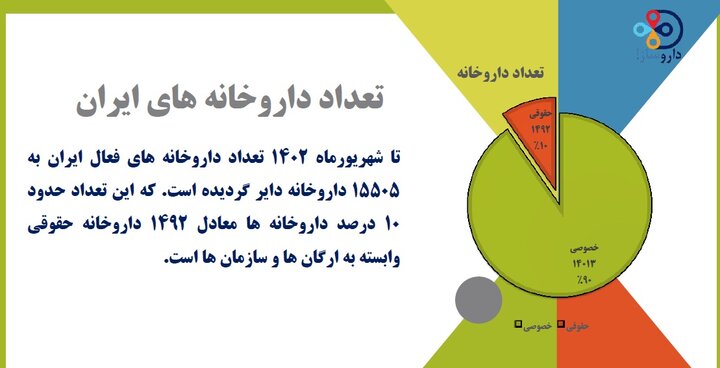 تعداد داروخانهها ۱۵۵۰۵ داروخانه است که حدود ۱۴۹۲ مورد آنها ماهیت حقوقی وابسته به ارگانهای دولتی دارند.