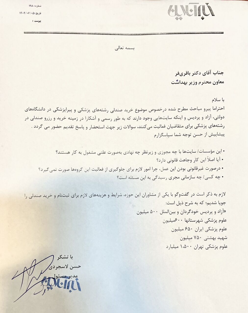 علیرغم پیگیریهای رسمی و جاری از سوی خبرآنلاین و گفتوگو با روابط عمومی معاونت آموزش وزارت بهداشت و مسئول دفتر معاون آموزشی وزارت بهداشت و با وجود ارسال نامه زیر و انتظار ۴۸ ساعته برای دریافت پاسخ بینتیجه ماند.