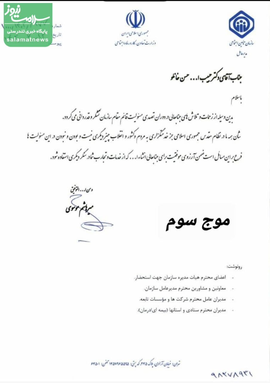 به گزارش پایگاه خبری پزشکان و قانون (پالنا)، طی این نامه حسن خانلو دیگر سمتی با عنوان مقام رئیس سازمان تامین اجتماعی ندارد.