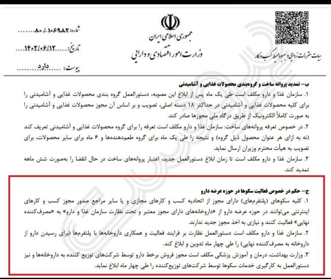 همچنین در این نامه آمده است وزارت بهداشت مکلف است مجوز فروش برخط دارو توسط شرکت های توزیع کننده به داروخانه ها و نیز دستورالعمل به کارگیری خدمات سکوها توسط شرکت های توزیع کننده را طی چهار ماه ابلاغ کند.