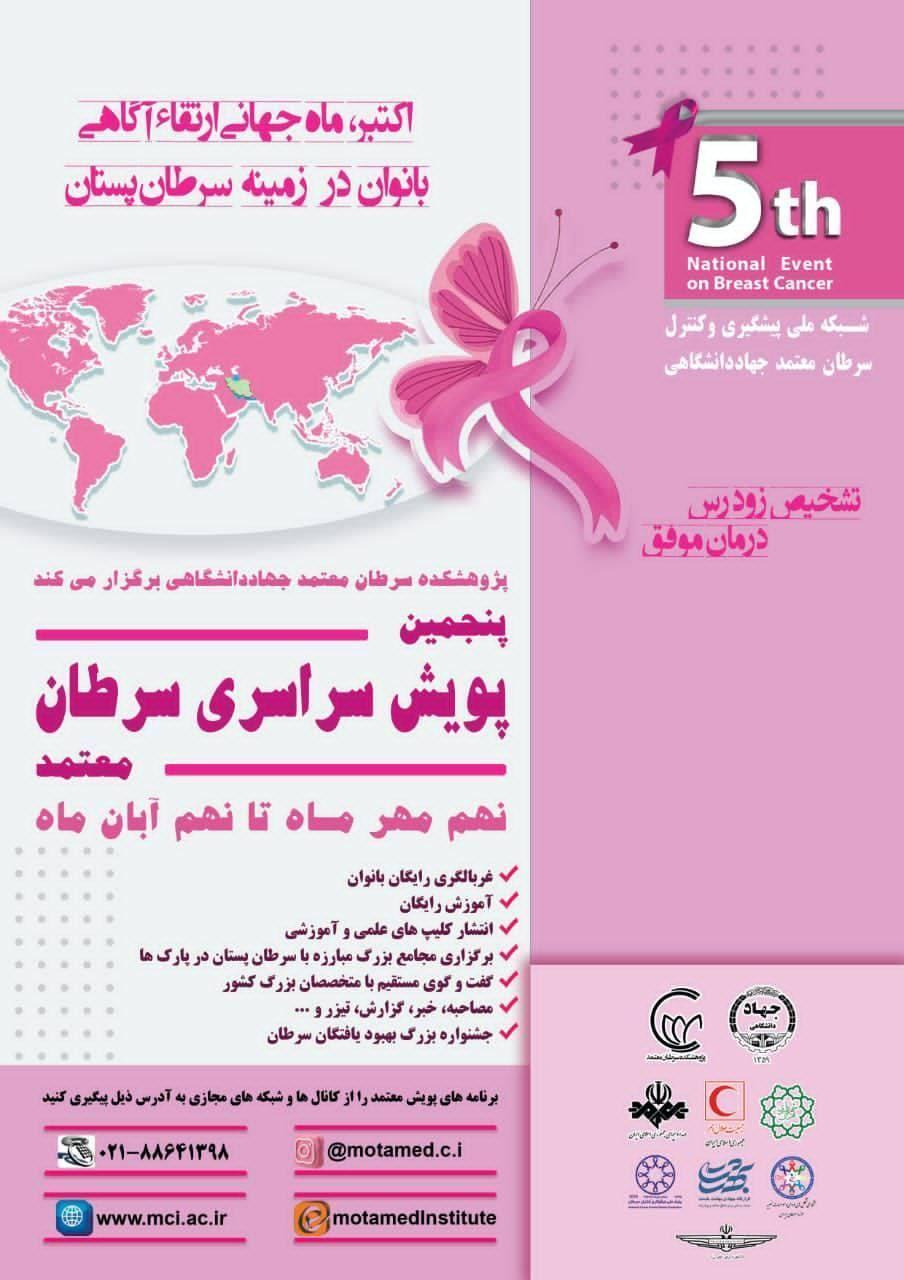 پنجمین پویش سراسری سرطان معتمد همزمان با آغاز ماه اکتبر "ماه جهانی ارتقای آگاهی بانوان در زمینه سرطان پستان" در قالب برنامههای متنوع آموزشی، ترویجی و غربالگری از ۹ مهرماه تا ۹ آبانماه ۱۴۰۲ برگزار میشود.