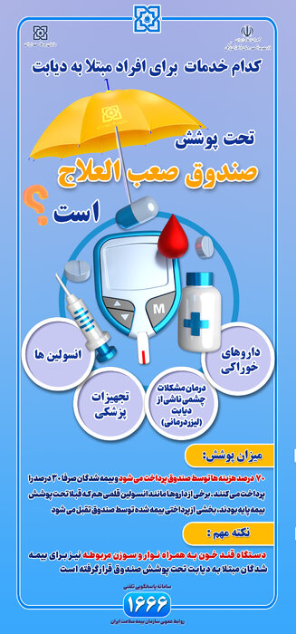 مدیرکل دفتر خدمات تخصصی سازمان بیمه سلامت ایران گفت: داروهای خوراکی، درمان مشکلات چشمی ناشی از دیابت "لیزر درمانی" تجهیزات پزشکی و انسولینها تحت پوشش صندوق حمایت از بیماران خاص قرار گرفت.