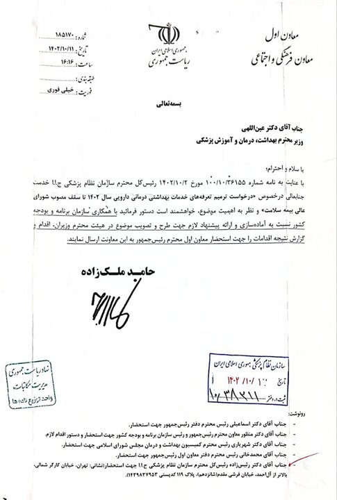این نامه در ادامه پیگیریهای سازمان نظام پزشکی برای اصلاح تعرفههای پزشکی صادر گردیده است. مهر